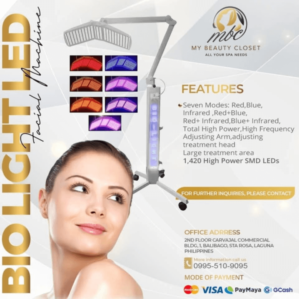 The machine comes fully equipped with 7 adjustable light settings, a flexible treatment arm, and a professional-grade LED panel.